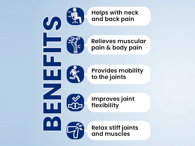 Formulated with Ayurvedic herbs renowned for their pain-reducing properties, this combo ensures a safe and natural approach to pain relief. It actively works to alleviate muscle stiffness, neck pain, arthritis, and joint pain, making conditions like frozen joints and back pain more manageable. Combining these three products not only helps relieve pain but also promotes the natural healing process of the body.