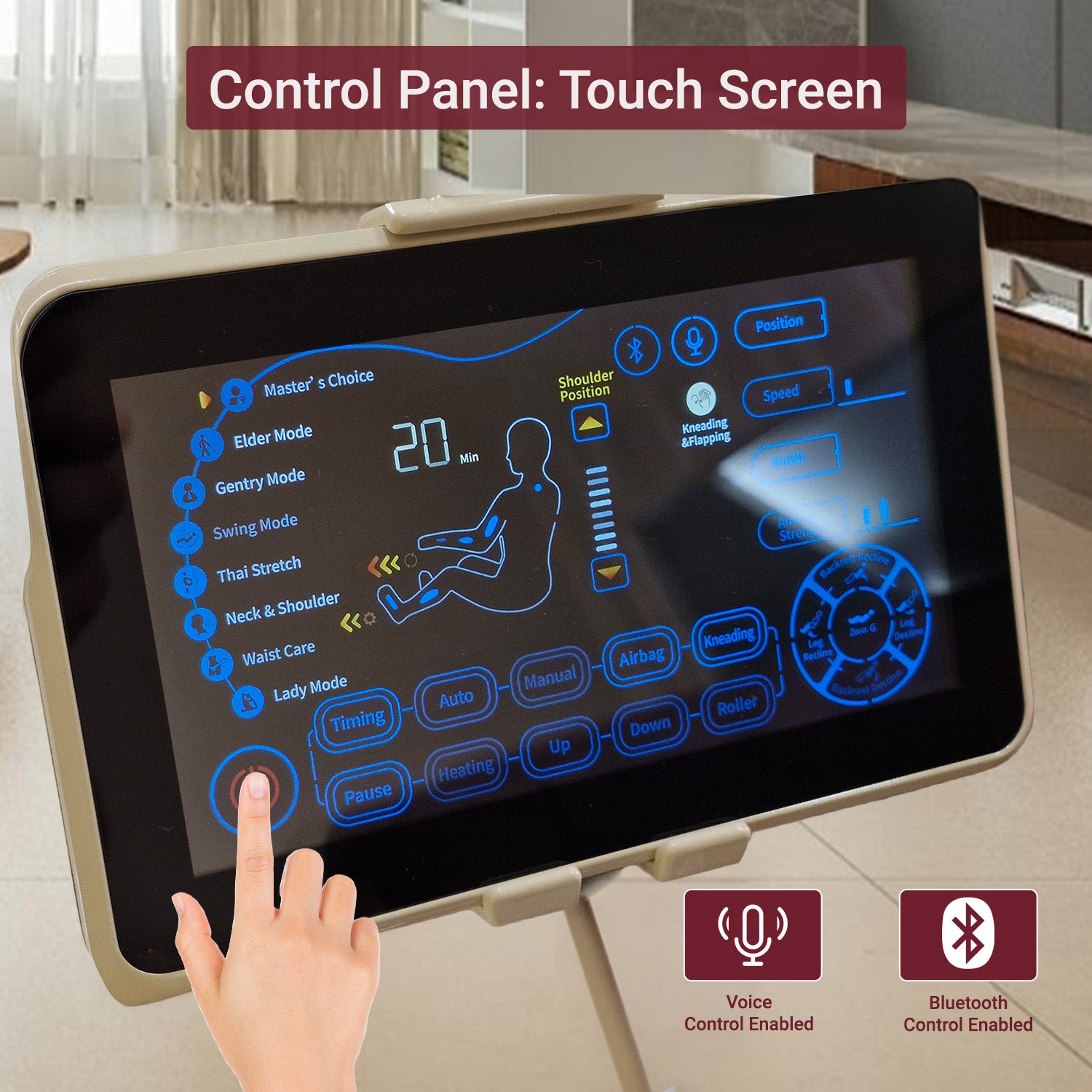 With the easy-to-use touch screen control, you can customize your massage experience. Adjust the intensity, select from different pre-programmed massage options, and control the recline to find the perfect position for ultimate relaxation.