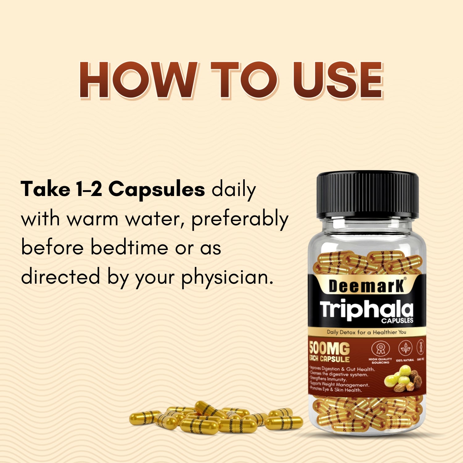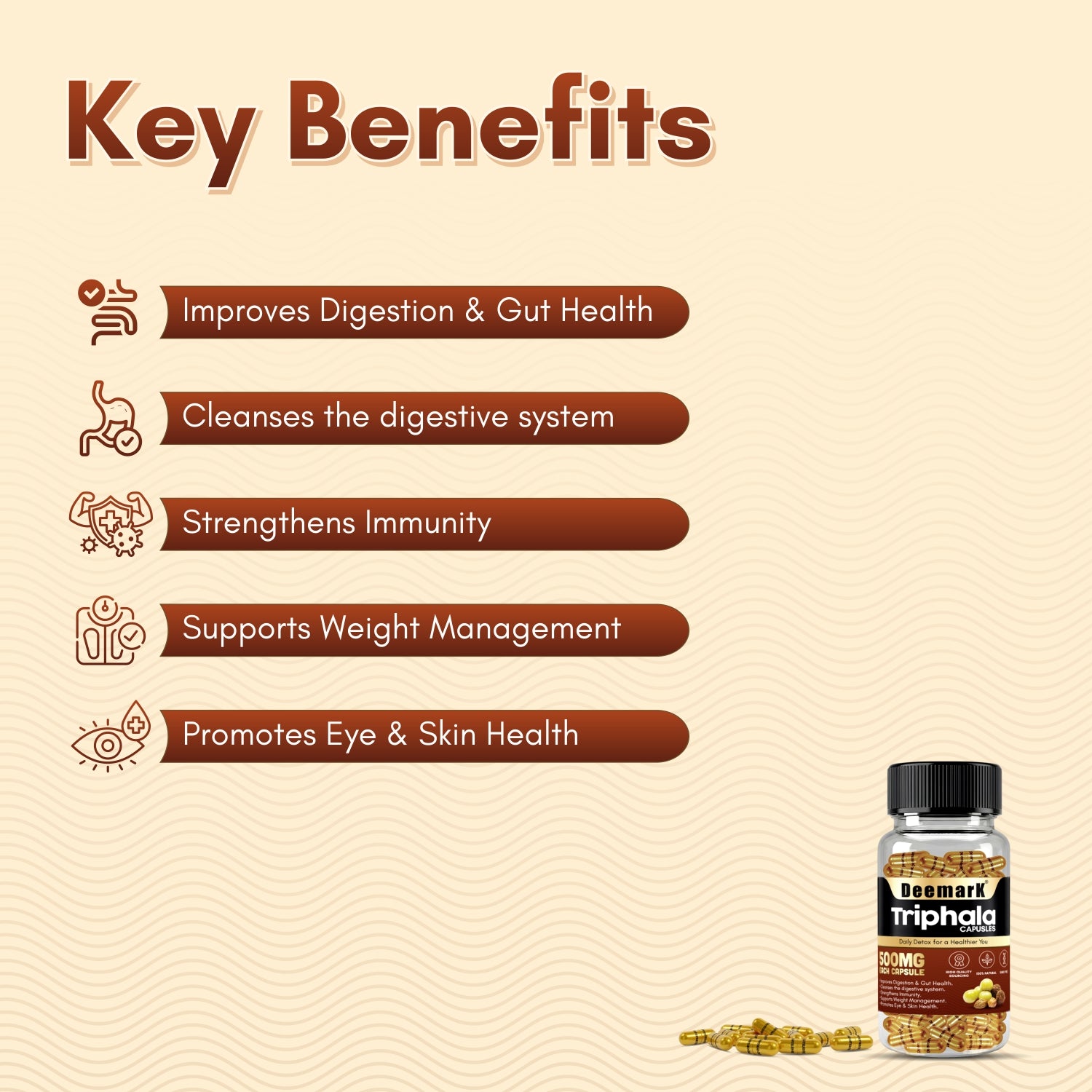 Our Triphala Capsules are a natural Ayurvedic digestive supplement formulated with Amla, Haritaki, and Bibhitaki. This powerful herbal combination supports gut health, colon cleansing, and natural body detox. It helps reduce bloating, relieve constipation, and improve digestion naturally.