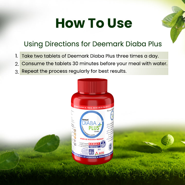 - Take two tablets of Deemark Diaba Plus three times a day.