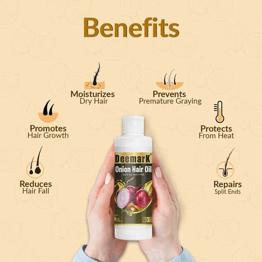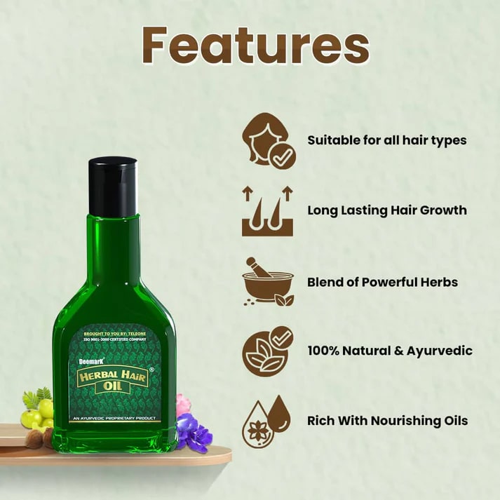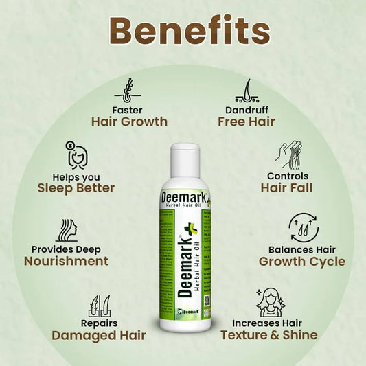 Besides promoting hair growth, herbal hair oil moisturizes and nourishes the hair, gives the hair a healthy shine and treats dandruff. Deemark Herbal Hair Oil is a safe and natural way for you to improve your hair's health. You can use it as part of your regular hair care routine for all hair types.