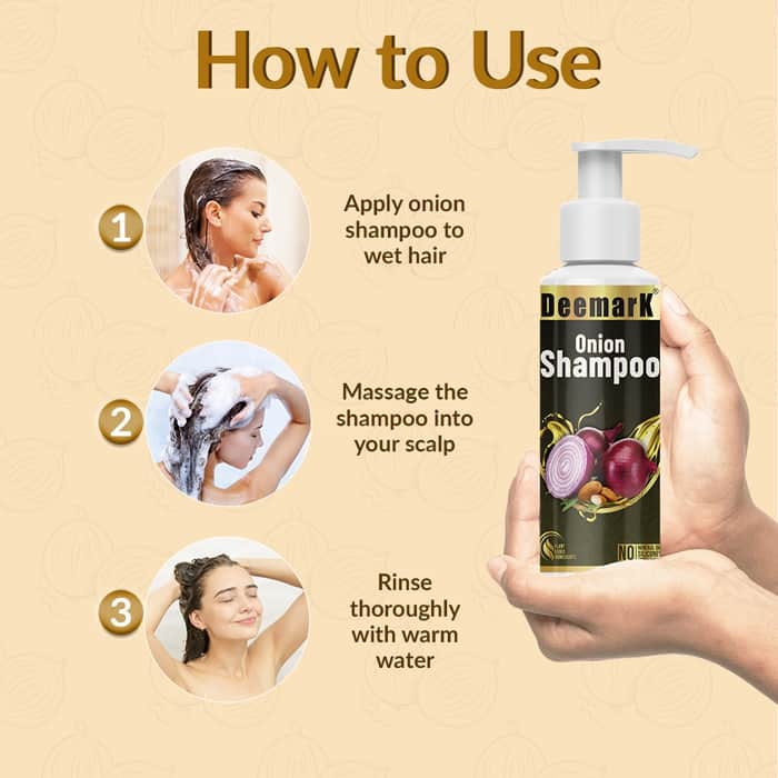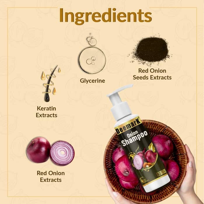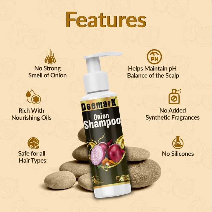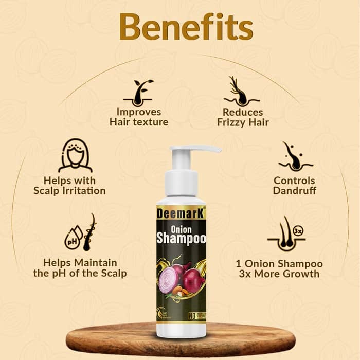 Deemark Onion Shampoo is a plant based shampoo that promotes hair growth, reduces hair fall, and improves scalp health. It contains red onion extracts, onion seed oil, and onion juice, which work together to strengthen hair, reduce hair fall, stimulate growth, and improve overall hair health.